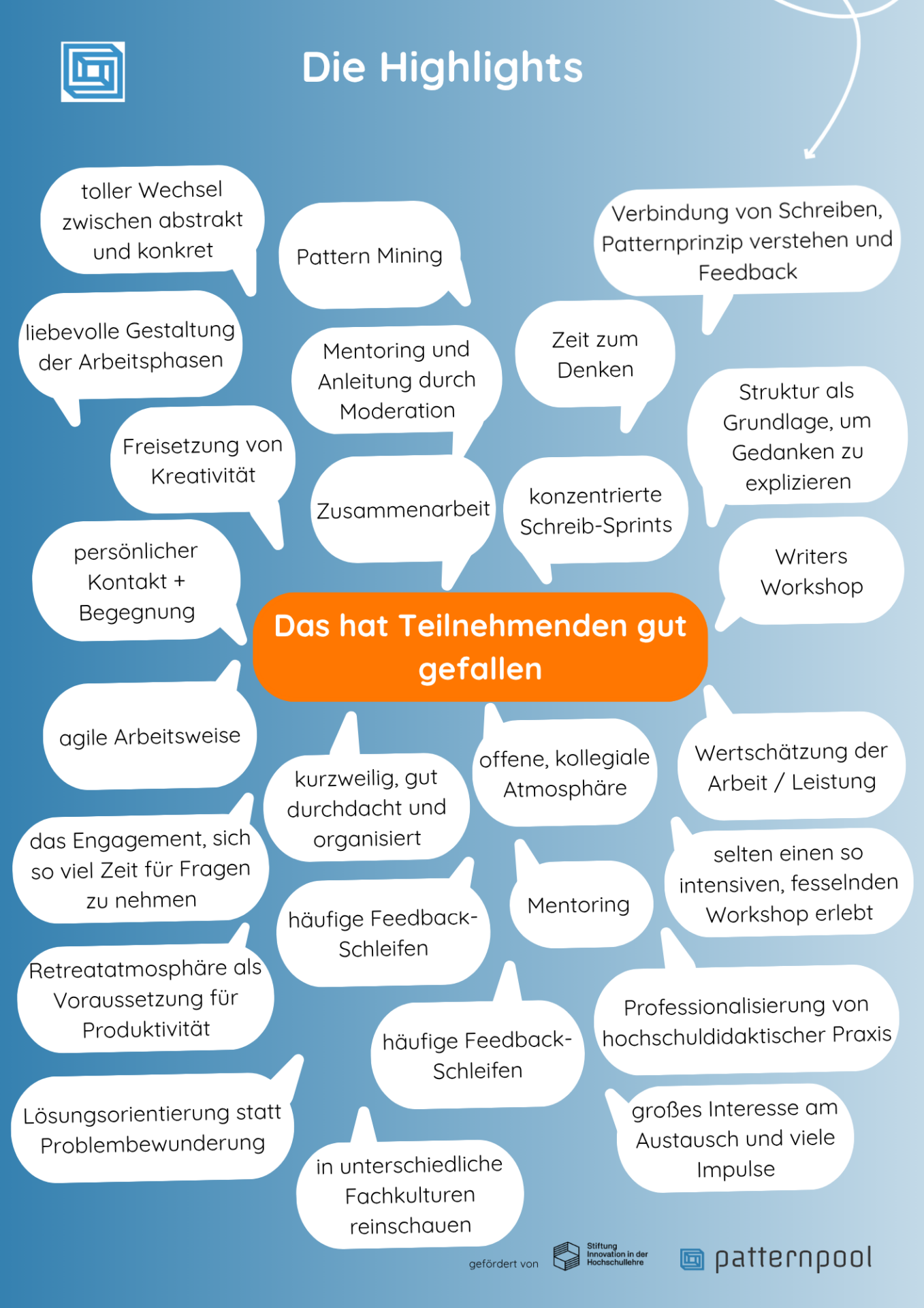 Falls Sie Interesse an einem Workshop haben und sich über das Schreiben eines Patterns länger in eine hochschuldidaktische Thematik vertiefen möchten, über didaktische Wirkmechanismen tiefer nachdenken oder auch ausprobieren möchten, mithilfe von Patterns konzeptionell zu denken, dann fragen Sie gern über info@patternpool.de an.Sie erhalten dann eine ausführliche Angebotsliste.