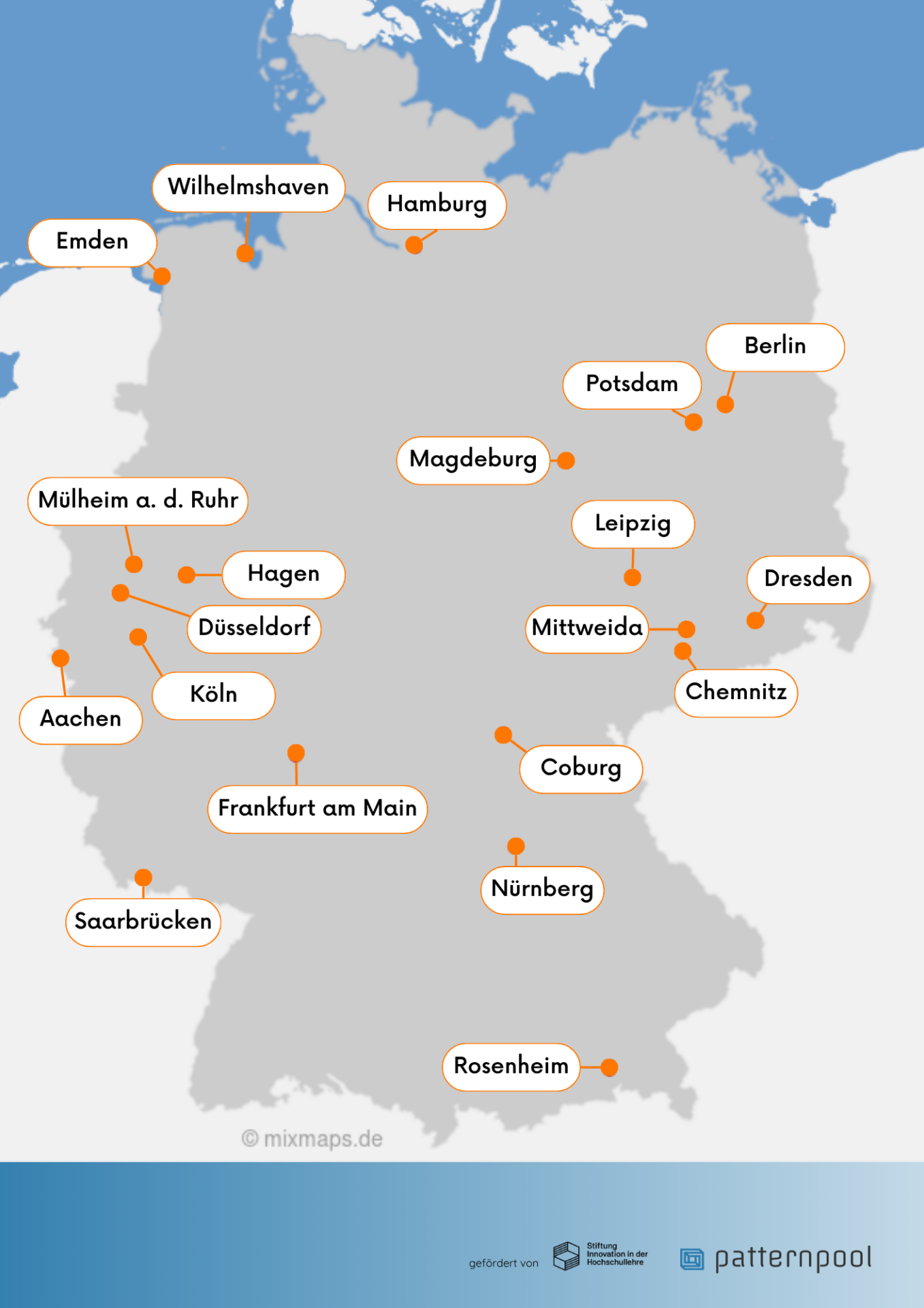 Diese Karte zeigt an, aus welchen Hochschulorten Autor*innen von Patternbeschreibungen kamen und kommen. Dabei wird deutlich, wie verbreitet das Portal und das Format der didaktischen Entwurfsmuster inzwischen sind.