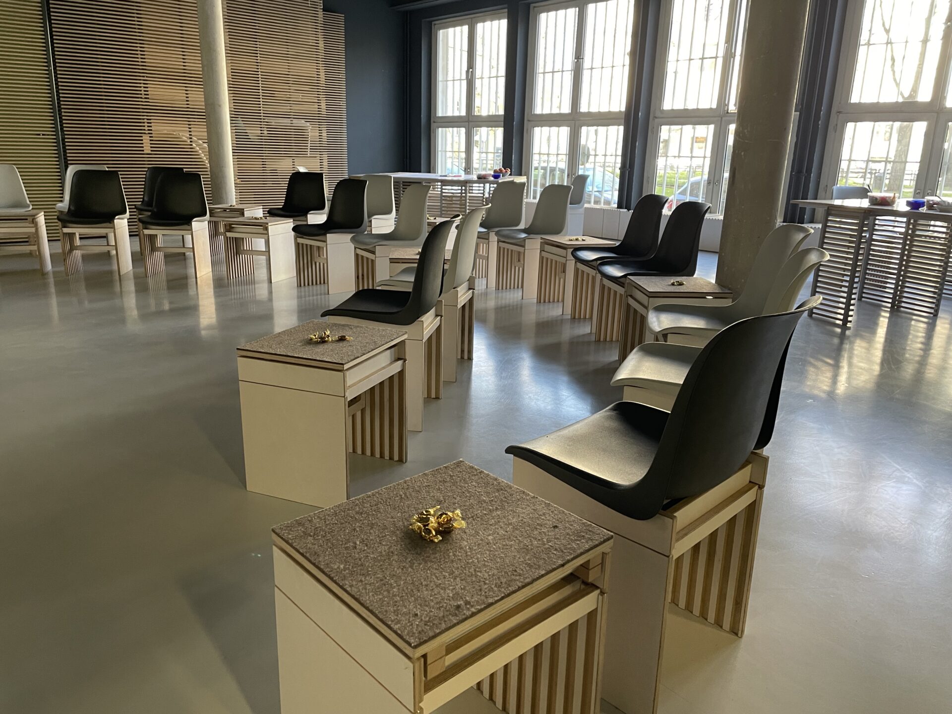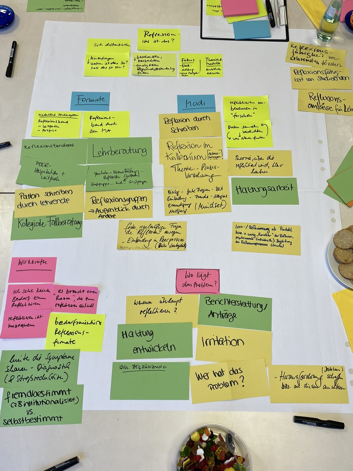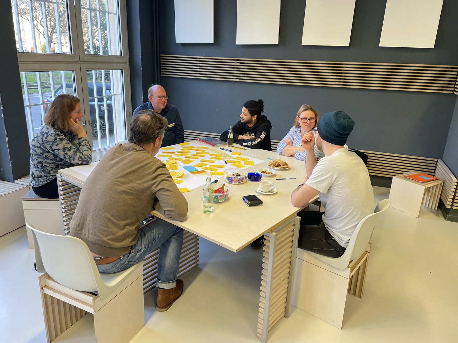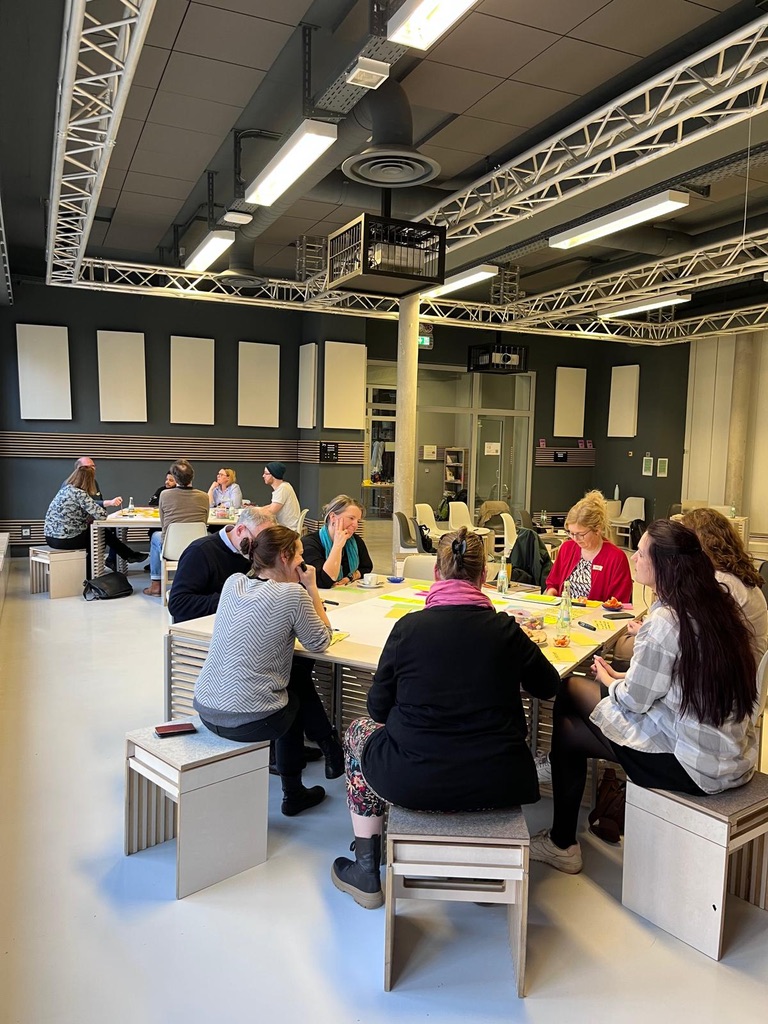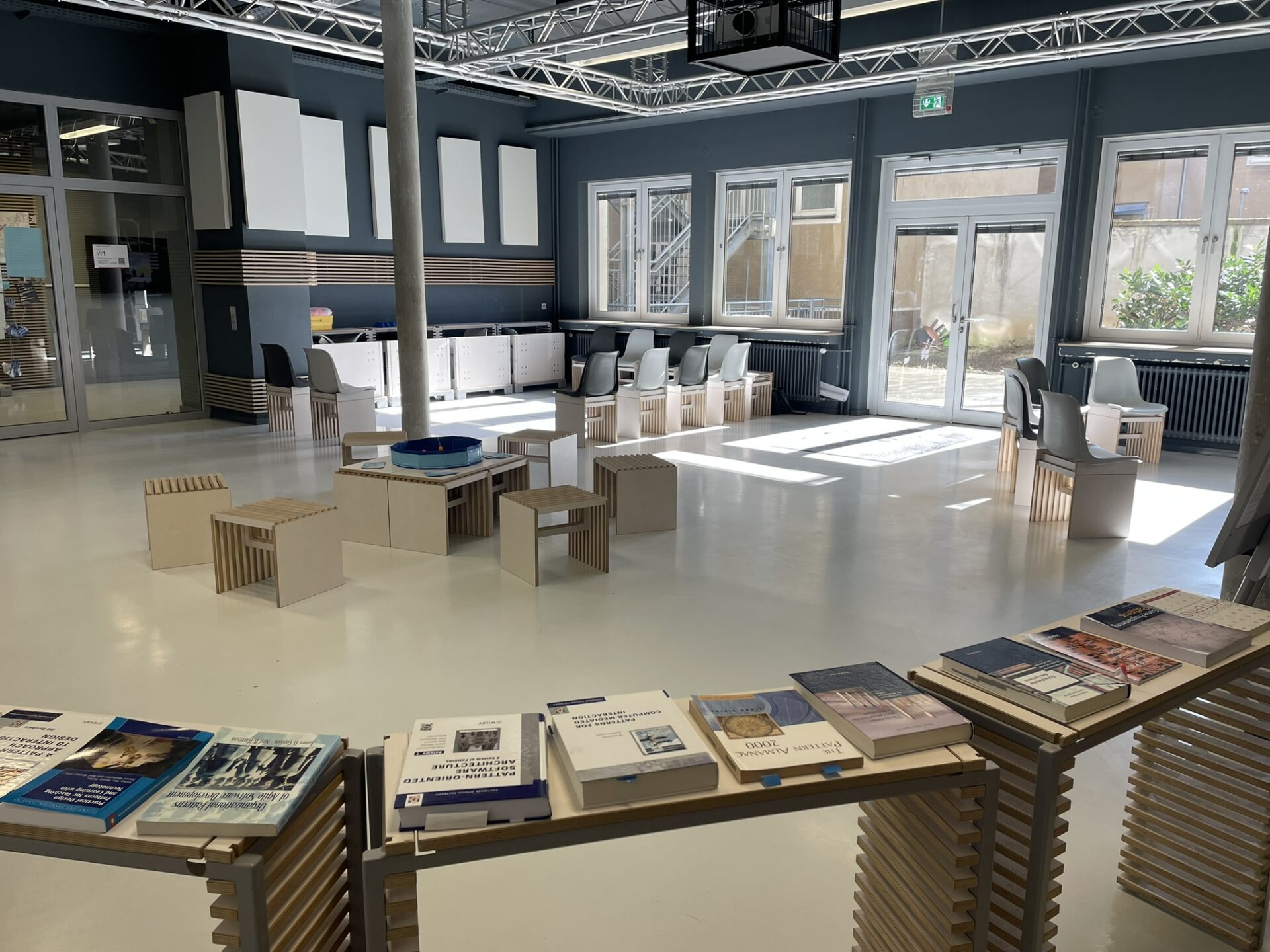 Die Bildungswerkstatt der TH Köln bot einen wirklich passenden Rahmen, nicht zuletzt, weil verschiedenste Raumlösungs-Patterns ganz einfach aufgebaut werden konnten: der Halbkreis mit Abstelltischen, mobile Gruppentische, eine Pattern-Erlebnis-Area mit einem Pool-Tisch mit Sitzgelegenheiten, einem Literatur-Stand, einem begehbaren Pattern-Reflexions-Parcours usw.